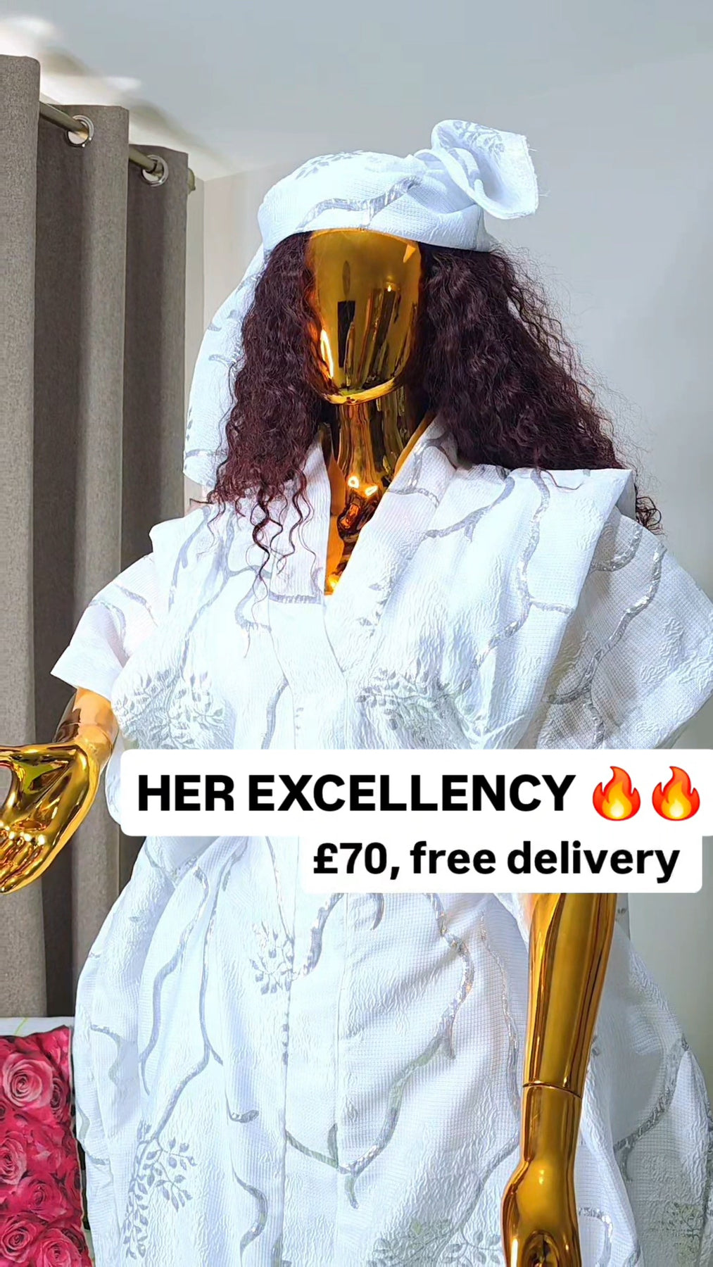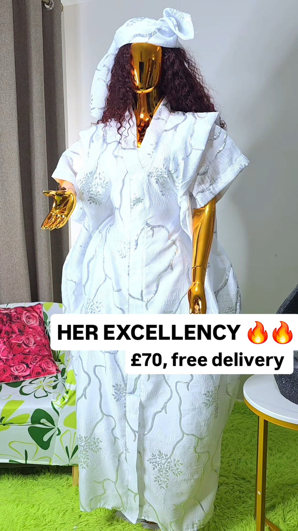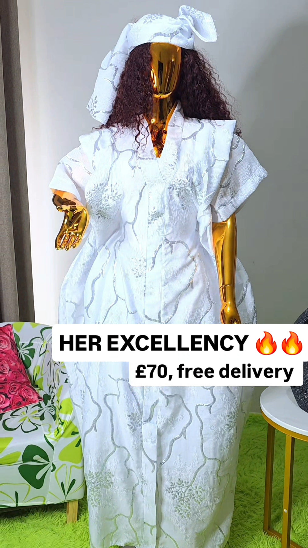 Crafted with rich detailing and a flowing silhouette, the kaftan flatters all body types, offering effortless comfort without compromising on sophistication. The luminous white fabric with intricate patterns exudes purity, power, and prestige – a true queen’s outfit.